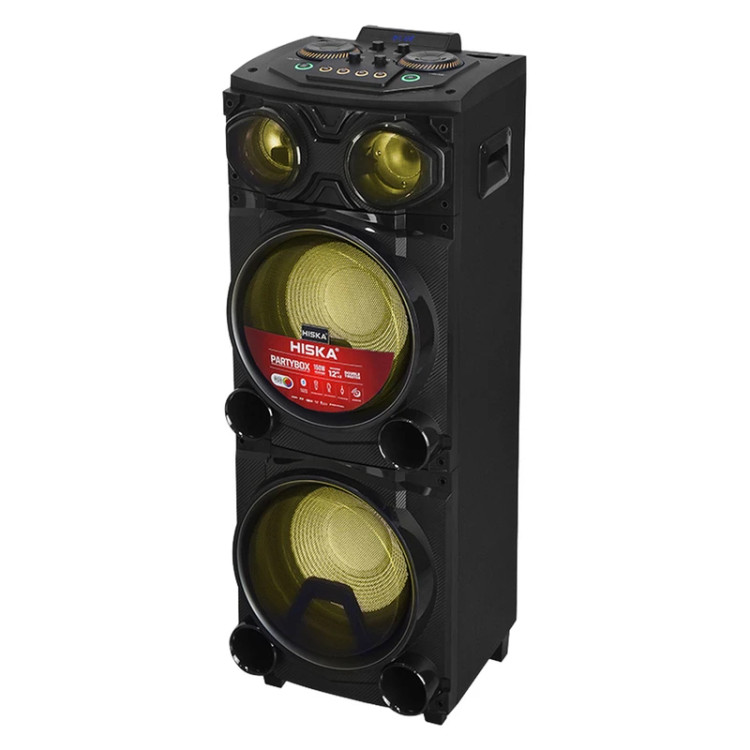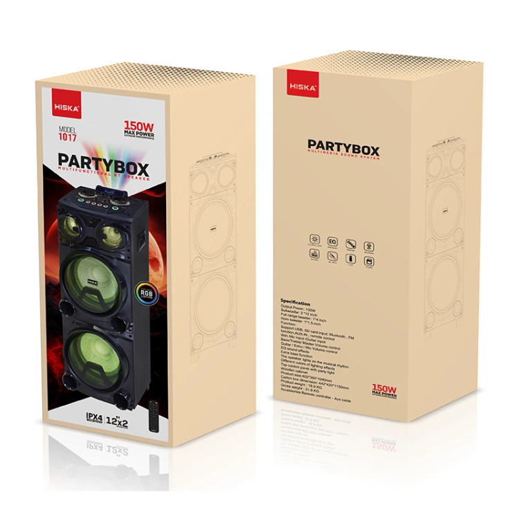پارتی باکس HISKA PARTY BOX 1017 دارای دو اسپیکر 12 اینچی /یک تیوتر 4 اینچی و یک تیوتر 1.5 اینچی که با کمک هم میتوانند صدای فوق العاده باکیفیت و گیرایی را تولید نموده و به گوش مخاطب برسانند. جنس بدنه این اسپیکر از چوب می باشد و ساب ووفر های اسپیکر خانگی هیسکا مدل 1017 دارای توری فلزی جهت محافظت از آنها در برابر آسیبهای احتمالی است. پارتی باکس 1017 دارای دو پنل مجزا است که به کمک آنها میتوان صدای موسیقی را به صورت استریو پخش نمود. با کمک این ویژگی میتوانید از تجربه گوش دادن ب ...