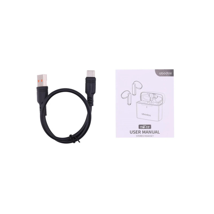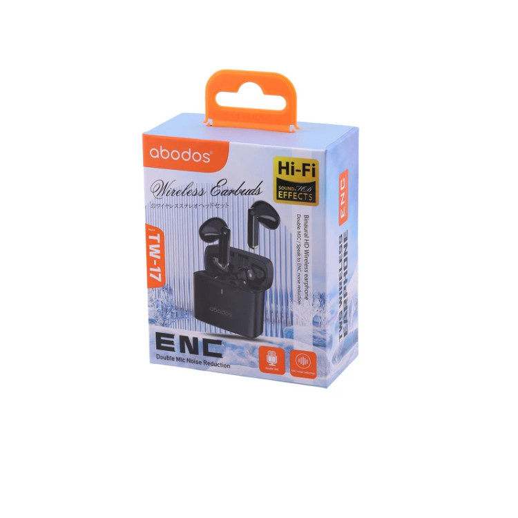 هندزفری بلوتوثی آبودس TW17 فرکانسی 2.4 تا 2.48 گیگاهرتز، امپدانس 32 اهم مجهز به بلوتوث نسخه ی 5.3 با اتصال سریع و پایدار قابلیت کاهش نویز ENC برای مکالمه ی شفاف و با کیفیت ماندگاری بالای باتری (6 الی 7 ساعت کارایی)، کیس شارژ با پورت تایپ سی