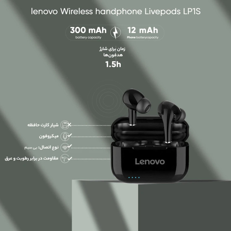 هندزفری Lenovo Livepods LP1S دارای یک داکت شارژ و دو ایرباد است که با قرار دادن هر کدام از ایربادها داخل داک شارژ علاوه بر نگهداری و حفاظت میتوانید آنها را شارژ کنید سری ایربادز مانند ایرپاد پرو اپل طراحی شده است که به درستی داخل گوش قرار میگیرد که به دلیل وزن کم آن بدون هیچ مزاحمتی میتوانید به مدت طولانی استفاده کنید. هندزفری لنوو LP1 که ظرفیت باتری داک شارژ 250 میلیآمپر است شما همچنان میتوانید چندین بار این ایربادها را با داکت همراه شارژ کنید و جمعاً 12 ساعت از آنها استفاده کنید که به مدت 1.5 ساعت ایربادز کامل شارژ میشود. این تست انجام شده با حجم صدای 50 درصد است که در شرایط مختلف میتواند متفاوت باشد. روی گوشیهای هندزفری کلیدهای لمسی وجود دارد که کاربردهای زیادی را برای کاربر فراهم میکند که میتوانید به مدیریت موسیقی و تماسها بپردازید. هندزفری Lenovo Livepods LP1S از بلوتوث نسخه 5.0 پشتیبانی میکند که باعث میشود اتصال پایدارتر و سریعتر داشته باشد و همچنین مصرف باتری را کاهش دهد. هندزفری Lenovo Livepods LP1S دارای استاندارد IPX4 است که در برابر تعریق و رطوبت مقاوم است و میتوانید در حین انجام فعالیت روزمره از آن استفاده کنید.