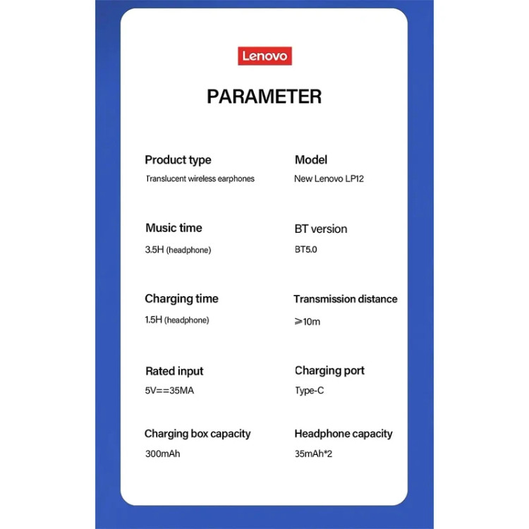 هندزفری بی سیم لنوو مدل Thinkplus LivePods LP12 جدیدترین محصول این کمپانی معتبر بوده که قابلیتهای ویژه بسیاری به آن اضافه نموده که از جمله آنها میتوان به قابلیت ENC یا حذف نویز اضافه، مجهز شدن به استاندارد ipx4 یا مقاومت در برابر آب و گرد و غبار و همچنین ارگونومی فوق العاده و جدید آن اشاره نمود. این هندزفری علاوه بر قابلیتهای فوق، با طراحی هوشمندانه، توانسته است رضایت اکثریت استفاده کنندگان با هر سن و جنسیتی(آقایان،بانوان و کودکان)را جلب کند و آن استفاده از طراحی فوق العاده قسمت سری آن است که به صورت لاستیک سیلیکونی (برای استفاده هنگام گوش دادن به موزیک و بیس شفاف و قوی) و(برای استفاده هنگام مکالمه و صدای شفاف) قابل استفاده است که همین ویژگی باعث آن شده که در هر گوشی با هر سایز و شکلی به راحتی و بدون مشکل فیت شود و از گوش بیرون نیفتد. همچنین در این مدل از باطری قویتر نسبت به مدلهای قبل استفاده شده به طوری که با هر بار شارژ، میتوان 5 ساعت مداوم به پخش موزیک ادامه داد. لازم به ذکر است که این محصول در همین مدت کوتاهی که به بازار ارائه شده توانسته در بیش از 50 کشور دنیا عرضه شود و مورد استقبال بیش از 100 میلیون نفر در سرتاسر دنیا قرار گرفته است.