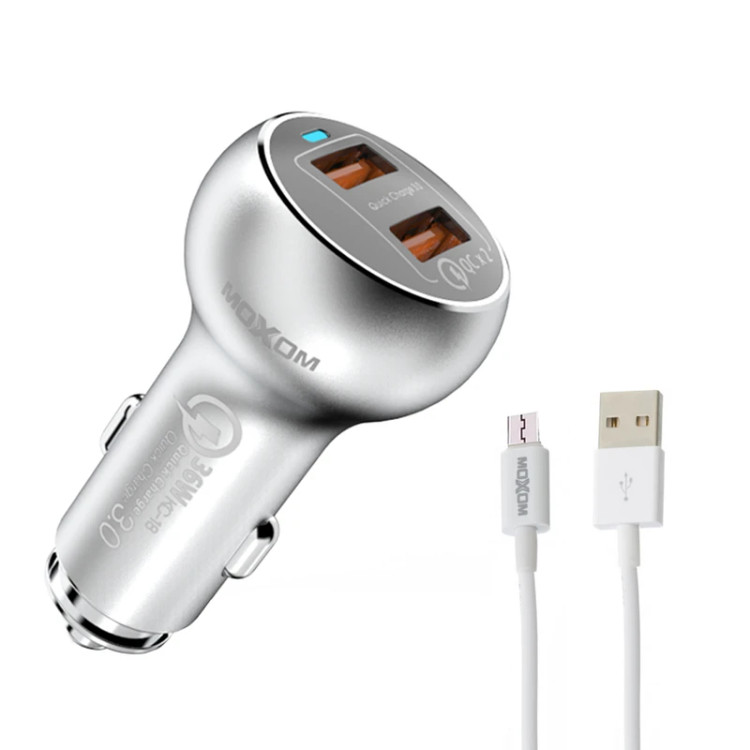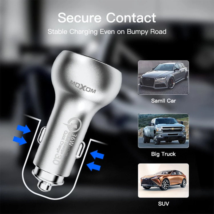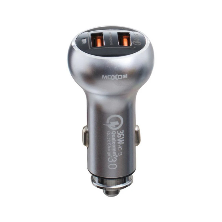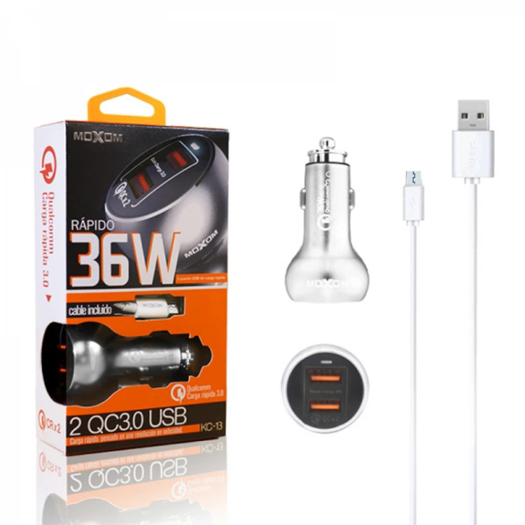 اگر به دنبال یک شارژر فندکی باکیفیت همراه با طراحی فشرده، باریک و جمعوجور هستید که با استفاده از آن امکان شارژ باتری دو دستگاه مختلف را به طور همزمان داشته باشید ، مدل «KC-13» از سری شارژرهای «Moxom» با توان 36 وات و تکنولوژی Quick Charge 3.0 در هر پورت گزینه مناسبی برای شماست. با کمک این شارژر میتوانید باتری دو گوشی موبایل یا دو آیپد و تبلت خود را با سرعت بالا شارژ نمایید.شدتجریان ورودی این شارژر 12و 24 ولت بوده و شدت جریان و ولتاژ خروجی آن 5V/3A , 9V/2A , 12V/1.5A است. این محصول با بدنه فلزی و مقاوم طراحی شده و تنها 40 گرم وزن داشته و به همراه یک کابل micro usb برای گوشی های اندروید عرضه می شود. برای استفاده از این شارژر فندکی، کافی است آن را بهطور مستقیم به درگاه فندک داخل ماشین وصل کرده و سپس دستگاه موردنظرتان را با استفاده از کابل USB موجود در بسته به شارژر متصل کنید. «KC-13» دارای تکنولوژی پیشرفته Quick Charge 3.0 برای ارائه سریعترین شارژ دستگاه های سازگار به QC3.0 است که باعث می شود باتری موبایل یا تبلت شما تا 80٪ فقط در 35 دقیقه شارژ شود.
