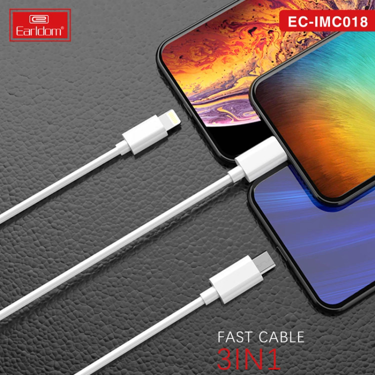 امروزه گوشی های موبایل دارای سه پورت شارژ لایتنینگ ، میکرو یو اس بی و تایپ سی می باشند که شما برای شارژ هر کدام از این دستگاه ها باید کابل مخصوص به آن را با خود داشته باشید.کمپانی Earldom با ساخت کابل EC-iMC018 باعث شده تا شما بتوانید با به همراه داشتن یک کابل هر سه گوشی را شارژ کنید.این کابل دارای کانکتور های Lightning ، Type-C و Micro USB بوده و به شما این امکان را می دهد تا هر نوع گوشی را با شدت جریان و ولتاژ 5V-3A شارژ کنید. توجه داشته باشید این کابل از تکنولوژی شارژ سریع 3 آمپر پشتیبانی می کند ولی در بعضی از گوشی ها علامت شارژ سریع نمایان نمی شود . این کابل از پلاستیک TPE نرم و ضخیم شبیه به جنس کابل های فابریکی ساخته شده است و مقاومت بالایی در برابر کشش و پارگی و گره خوردن دارد.طول 120 سانتی متری این کابل باعث شده تا برای استفاده های روزمره بسیار مناسب باشد.