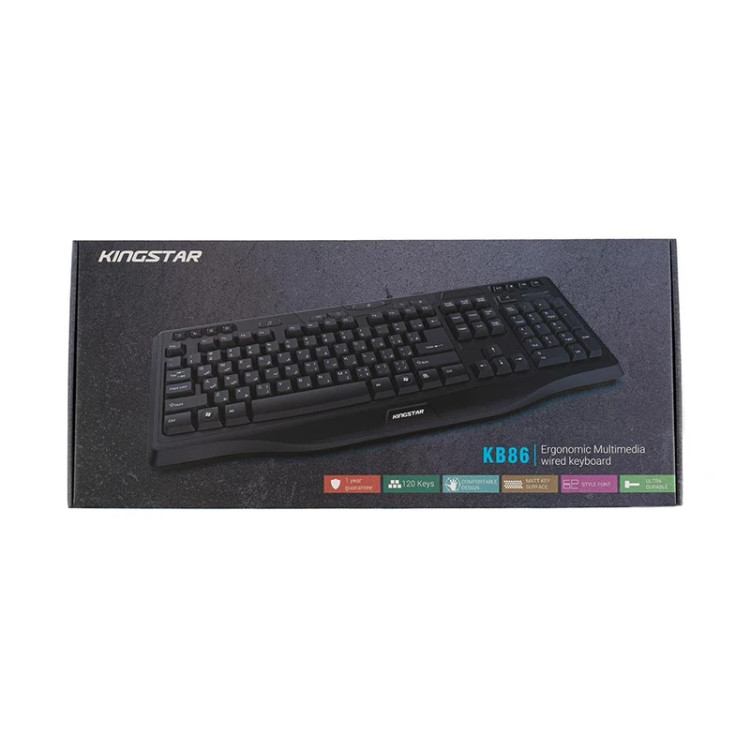 کیبورد «KB86» محصولی از شرکت «کینگستار » است که به صورت باسیم و از طریق درگاه USB به کامپیوتر متصل میشود. این کیبورد دارای 120 کلید برای انجام فعالیتهای کامپیوتری است؛ همچنین کیبورد KB79 دارای 16 کلید میانبر برای انجام سریعتر کارهاست که شامل Web Home - Music - Play/Pause - Pre Track - Next Track- Volume - Stop - Closure - Power - Dormant - My Computer - E-Mail -Refresh -Favorites - - Calculator - در قسمت بالای کیبورد قرار گرفتهاند. کیبورد کینگستار مدل KB86 برای استفادههای روزمره مناسب است طراحی کلید ها به نوعی است که امکان تایپ کردن در مدت زمانی طولانی را فراهم میکند - دسترسی راحت به تمامی کلید های کاربردی - طراحی نرم و سایلنت کلید ها - با دوام - کلید های مات