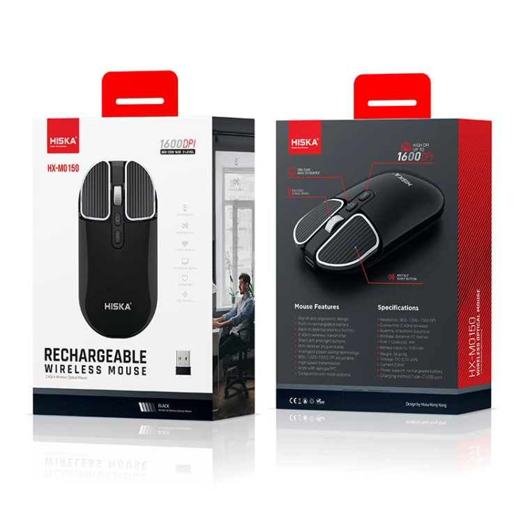 ماوسها ازجمله پرکاربردترین لوازم جانبی کامپیوتر هستند که برای ارسال فرمانها در رایانه مورد استفاده قرار میگیرند. امروزه ماوسهای وایرلس کاربرد بیشتری برای کاربران دارد. کمپانی هیسکا نیز در راستای جلب رضایت کاربران خود در رابطه با محصولات وایرلس اقدام به تولید ماوسهای بیسیم کرده است. این کالا با 5کلید و باتری لیتیم یون قابل شارژ، دارای قابلیت اتصال به وسیلهی دانگل USB 2.4 گیگاهرتز نیز میباشد. ماوس وایرلس هیسکا مدل HX-MO150 با محدوده عملکرد 10متر از کیفیت بسیار بالایی برخوردار است. همچنین علاوه بر قابلیت انتقال و عملکرد سریع، با 3میلیون بار کلیک از طول عمر قابل توجهی برخوردار میباشد. این ماوس بیسیم دارای 3 حالت دقت قابل تنظیم 800-1200-1600 DPI میباشد که برای کاربران میزان قابل توجهی است. از ویژگیهای ظاهری این ماوس هم میتوان به طراحی شیک و خاص بدنهی آن اشاره کرد. همچنین ابعاد این ماوس 112x60x26 و وزن آن نیز 70 گرم میباشد. همچنین این ماوس دارای باتری قابل شارژ 500 میلی آمپر ساعتی است که با یک کابل تایپ سی قابلیت شارژشدن را دارد.