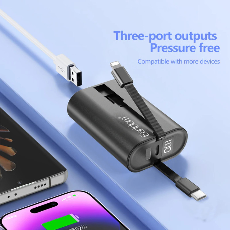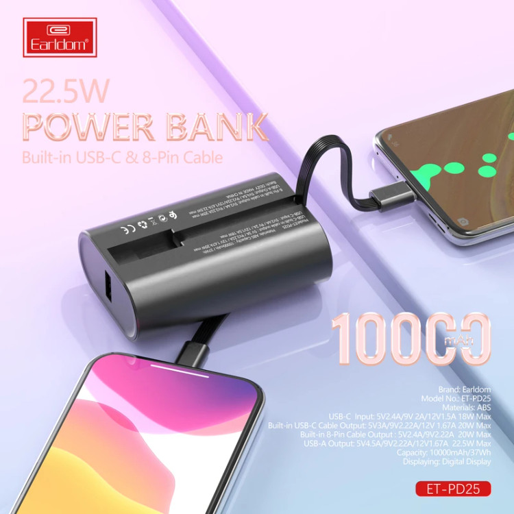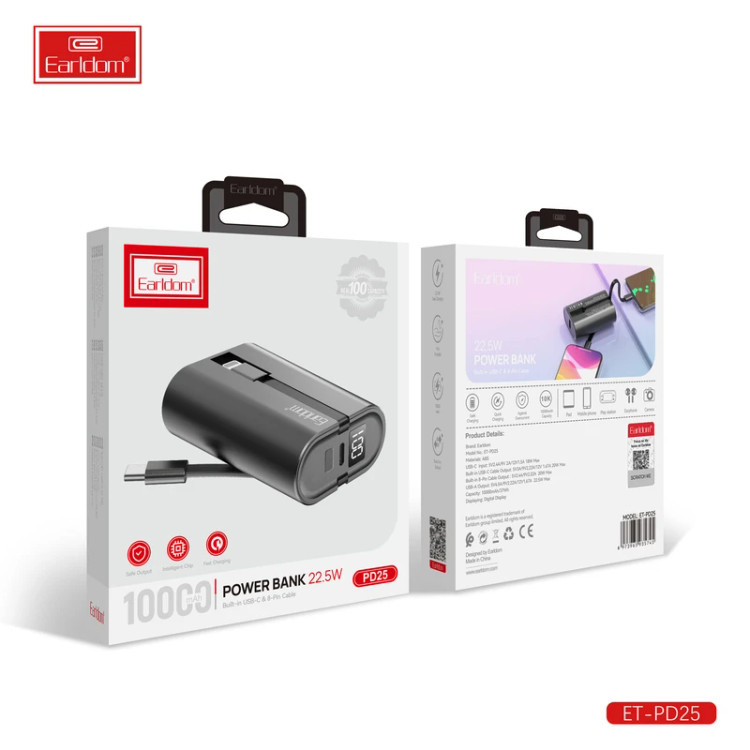 پاوربانک ارلدام مدل PD25 با ظرفیت 10000 میلیآمپر ساعت (37 واتساعت) و توان خروجی حداکثر 22.5 وات، انتخابی بینقص برای شارژ سریع انواع دستگاههای الکترونیکی است. بدنهی این محصول از جنس PC + ABS مقاوم و ضدحریق ساخته شده که علاوه بر استحکام، سبک و خوشدست است. باتری قدرتمند Jiatuo و چیپ هوشمند داخلی، جریان و ولتاژ مناسب هر دستگاه را تشخیص میدهند تا شارژی ایمن و پایدار فراهم شود. این پاوربانک دارای دو کابل سرخود (یکی تایپ C با خروجی حداکثر 22.5 وات و دیگری لایتنینگ با خروجی حداکثر 20 وات) است و علاوه بر آن یک پورت USB-A نیز برای شارژ همزمان چند دستگاه دارد. ورودی USB-C آن از شارژ سریع با توان حداکثر 18 وات پشتیبانی میکند و نمایشگر LED وضعیت شارژ باقیمانده را بهوضوح نمایش میدهد. PD25 مناسب شارژ گوشی، تبلت، ساعت هوشمند، ایرپاد و سایر گجتهای شماست و با طراحی مینیمال و سبک خود، همیشه و همهجا همراه مطمئن شما خواهد بود.