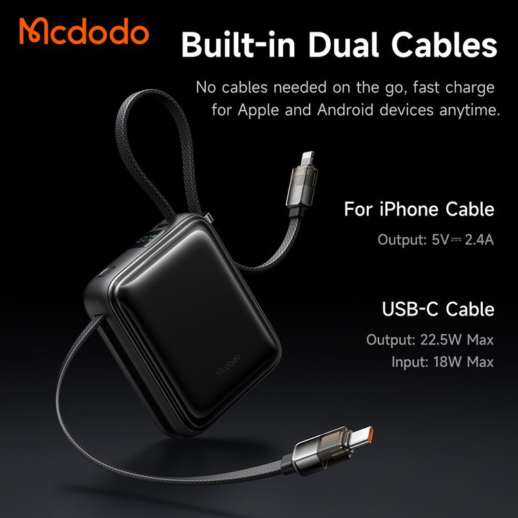 یکی از نوآوریهای کلیدی و برجسته در طراحی Mcdodo MC-255، تعبیه دو کابل شارژ پرکاربرد، یعنی کابل Type-C و کابل Lightning، به صورت یکپارچه در بدنه پاوربانک است. این ویژگی، شما را از حمل کابلهای اضافی بینیاز میکند و دغدغه فراموش کردن یا گم شدن کابلها را از بین میبرد.
